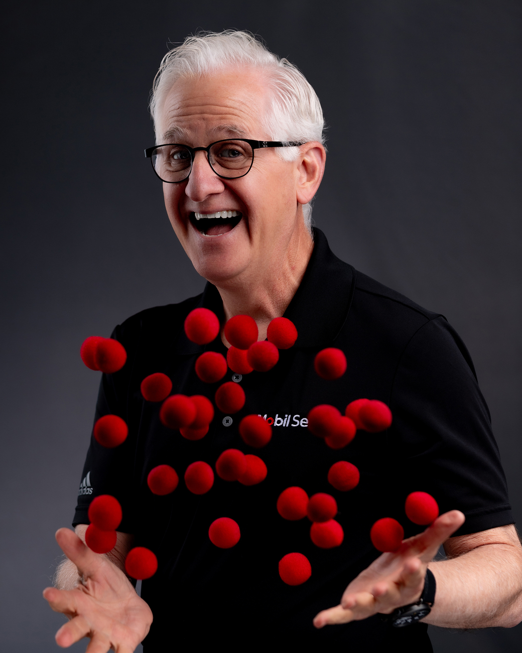 I captured this image of magician Danny Orleans While shooting headshots at a convention in Phoenix, AZ. I noticed Danny a few booths away doing his magic. I asked him if I could take a few action shots. I had him toss the balls and this was the result.